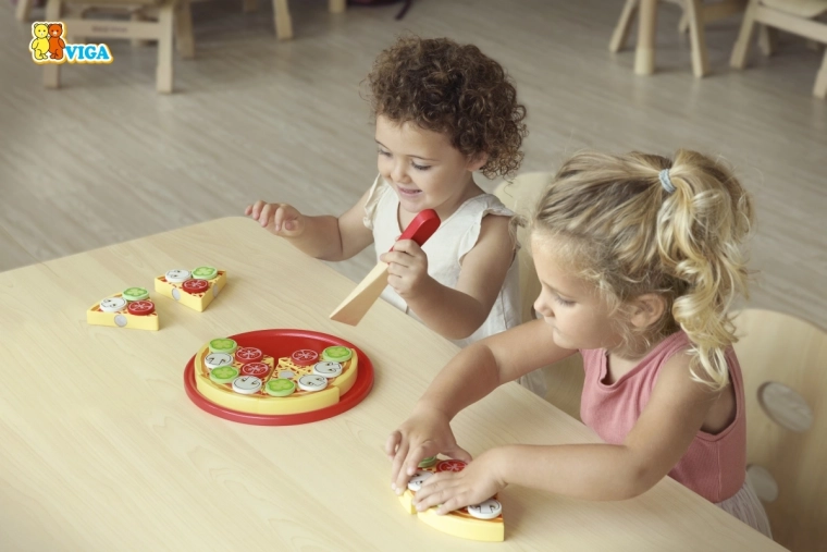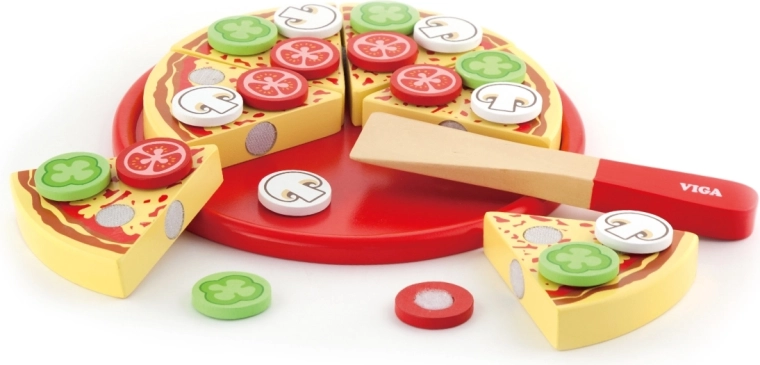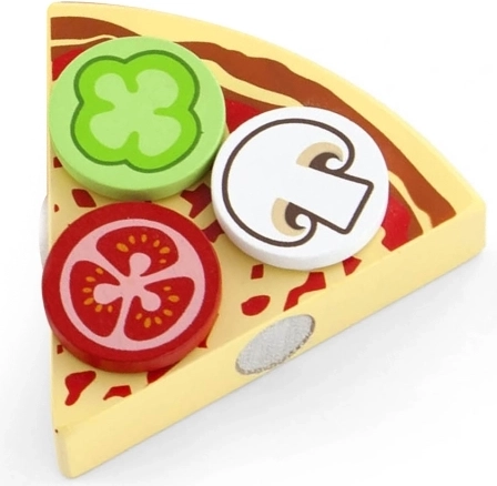 Verschillende houten toppings (bijv. champignons, paprika, tomaat) stimuleren de fantasie en het leren van kleuren en vormen.