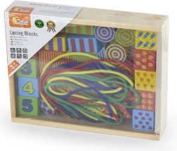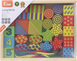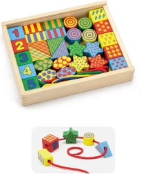 Deze houten rijgset biedt kinderen eindeloze knutselmogelijkheden: rijgen als kralen, torens en huisjes bouwen of sorteren op kleur en vorm. De grote stukken (ca. 4 cm) liggen prettig in de hand en zijn ideaal voor de eerste motorische oefeningen.