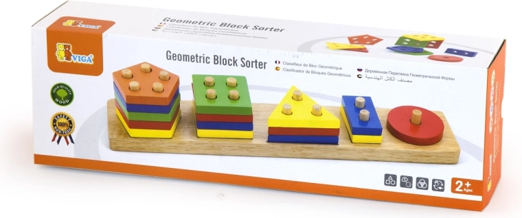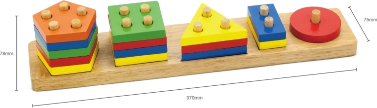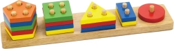 Deze stevige houten inlegpuzzel combineert het sorteren en op de pinnen rijgen van vormen. Kinderen leren kleuren en geometrische vormen onderscheiden, oefenen de oog-handcoördinatie en verbeteren hun behendigheid bij het hanteren van de onderdelen. Het hout is glad geschuurd en de kleuren zijn helder en aantrekkelijk.