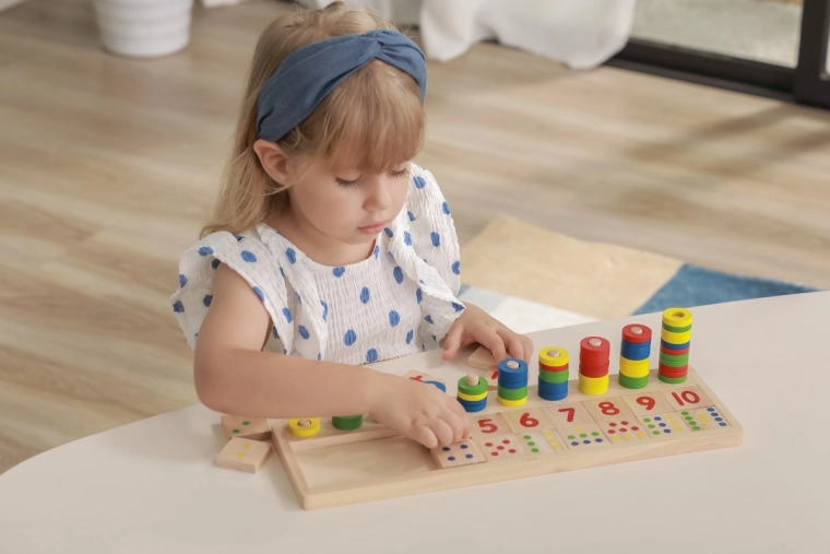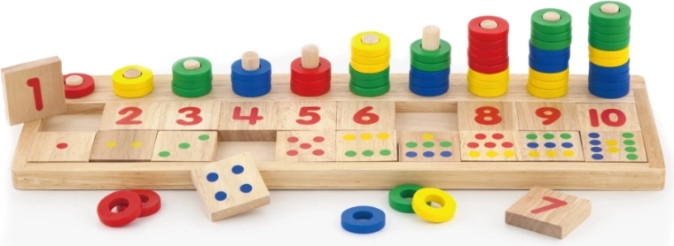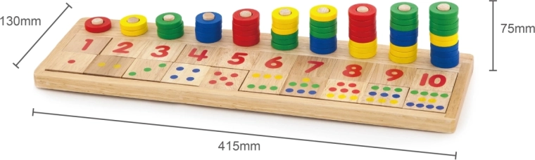 Het speelgoed is gemaakt van ecologisch hout, wat veiligheid en aangenaam gevoel bij aanraking garandeert. Dankzij de gemakkelijk verwijderbare tegels met cijfers kunnen kinderen ook eenvoudige wiskundige sommen zoals optellen en aftrekken leren.