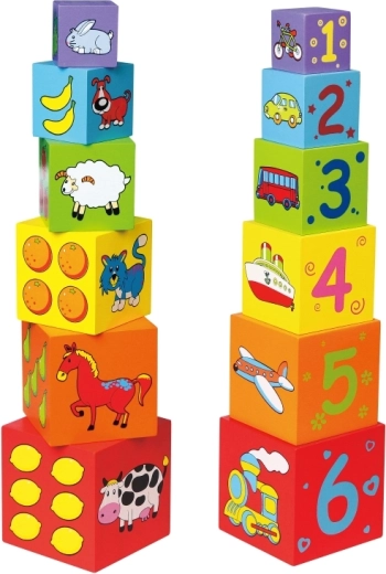 Elke zijde van het blok is versierd met verschillende motieven, zoals dieren, cijfers, fruit en vervoermiddelen, die de verbeelding van kinderen verrijken.