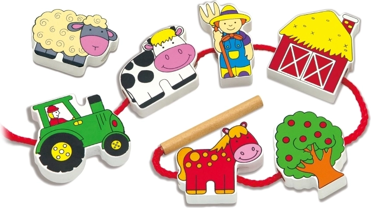 De VIGA Houten Rijgblokken Boerderij zijn ontworpen om elk kind te boeien. Deze set bevat 12 kleurrijke blokken met boerderijmotieven die je kind aan elkaar kan rijgen met de meegeleverde veter. Er zijn verschillende vormen, zoals een koe, eend, kat, kip, hond, paard, schaap, boer en zijn vrouw, tractor, schuur en appelboom.