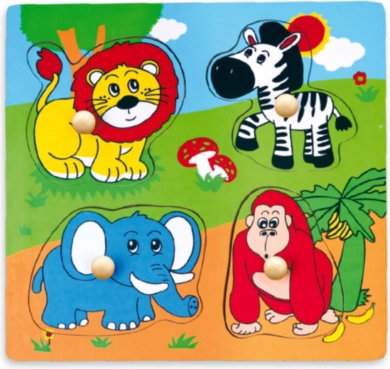 Deze kwalitatieve houten inlegpuzzel met safarithema is een ideale eerste puzzel voor peuters. Elk stukje heeft een houten knopje voor gemakkelijk vastpakken met kleine handjes en een passende silhouetvorm op de onderplaat voor eenvoudige oriëntatie.