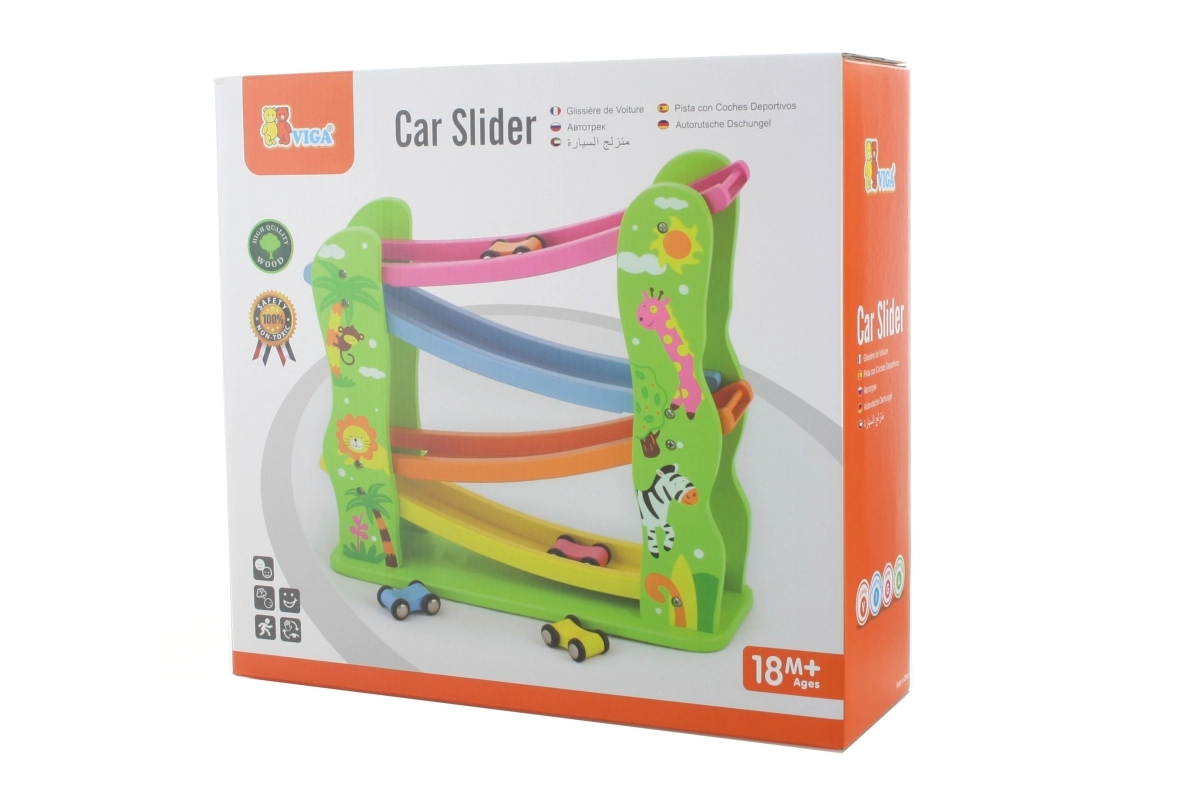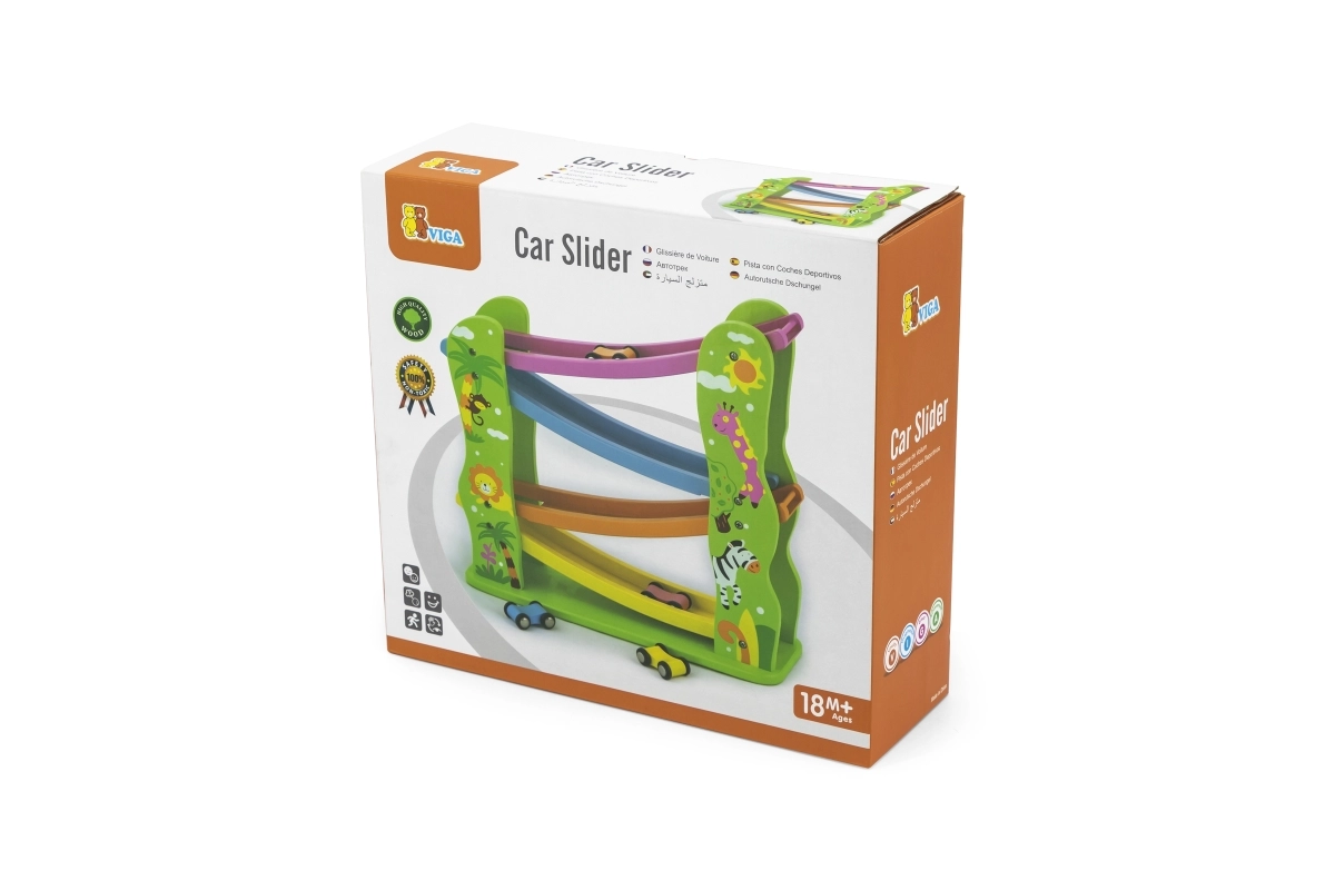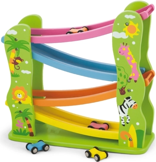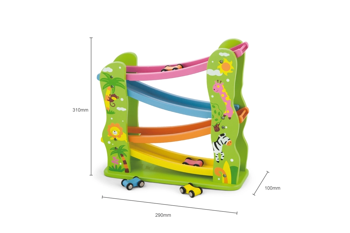 Deze prachtig gekleurde houten glijbaan is perfect voor de allerkleinsten die willen spelen en tegelijk hun vaardigheden ontwikkelen. Hij bevat een baan met meerdere niveaus in verschillende kleuren en laat de autootjes soepel over het parcours rijden.