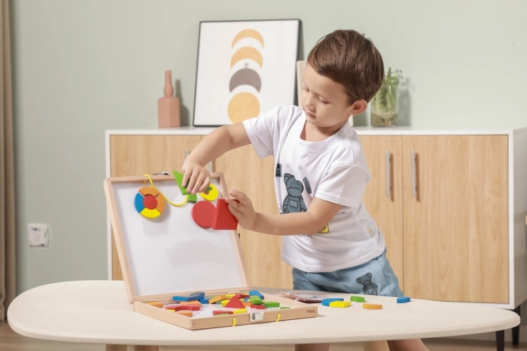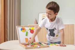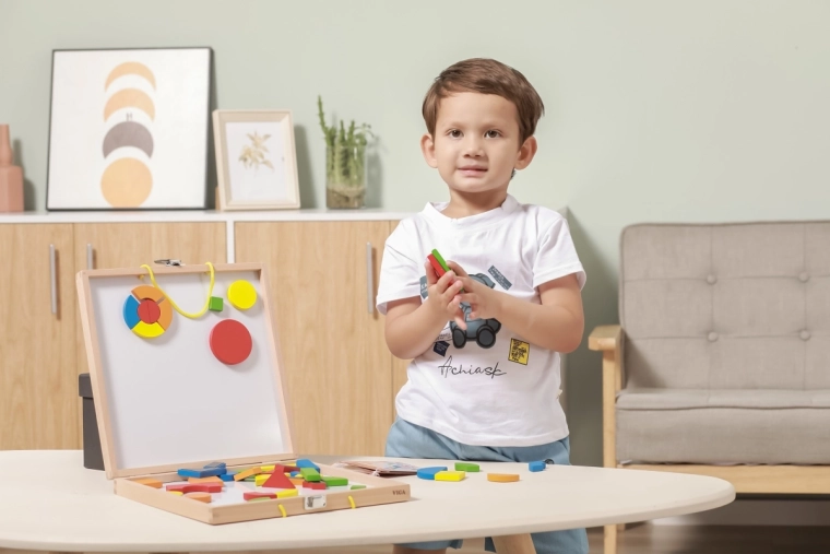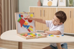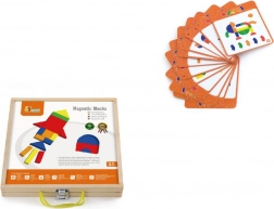De set bevat 42 houten magnetische onderdelen in verschillende vormen en kleuren en ook 12 dubbelzijdige kaarten met in totaal 24 creatieve voorbeelden voor een vlotte start. Tijdens het spelen trainen kinderen de fijne motoriek, de oog-handcoördinatie, het waarnemen van kleuren en vormen en het ruimtelijk inzicht.