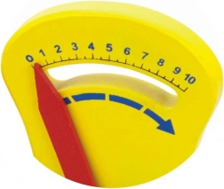Bij het indrukken van het weegplateau beweegt de wijzer en toont hij de cijfers 0–10. Kinderen zien direct het ‘weegresultaat’ en leren het verband tussen druk en waarde.
