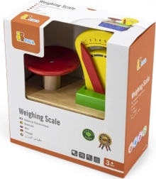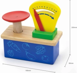 Deze robuuste houten weegschaal laat kinderen op een speelse manier kennismaken met gewichten en cijfers. Met een simpele druk op het weegplateau beweegt de wijzer en verschijnen de waarden op de wijzerplaat – zo begrijpen kinderen gemakkelijk de basis van meten en balans. Dankzij de vrolijke kleuren en de duidelijke schaalverdeling is de weegschaal een geweldige aanvulling voor de speelgoedkeuken en het winkeltje.