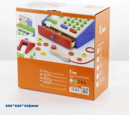 Deze kleurrijke houten kassa voor kinderen biedt een realistische winkelervaring – het indrukken van toetsen, het openen van het laatje met “contant geld”, betalen met kaart of met de scanner en het “printen van bonnetjes”. Dankzij de doordachte accessoires oefenen kinderen eenvoudig rekenen, communicatie en samenwerking.