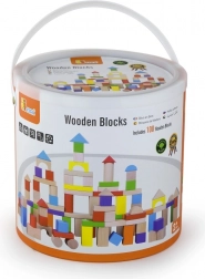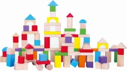 Creatieve houten bouwset met 100 stukjes in een praktische emmer. Gekleurde blokken in verschillende vormen stimuleren de fijne motoriek en de fantasie; inclusief een illustratieve brochure. Leeftijd 2+.