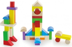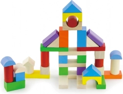 Blokken in de vorm van rechthoeken, kubussen, cilinders en bogen (afmeting 2,5–7,5 cm) inspireren tot het bouwen van torens, bruggen en hele stadjes.