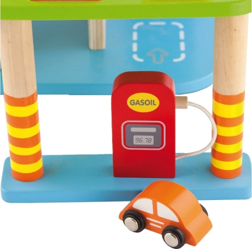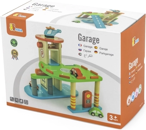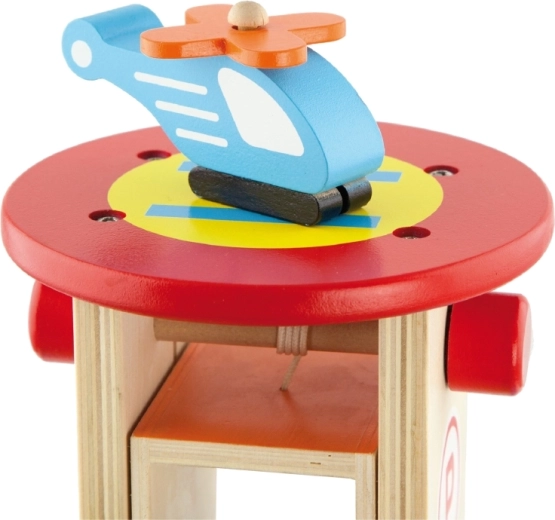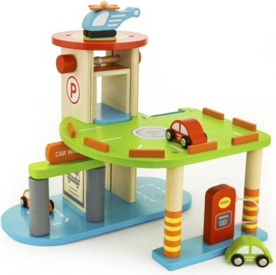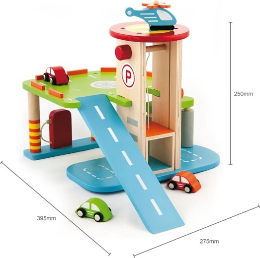 Ontdek de leuke houten garage met 3 autootjes en een helikopter, die zowel de fantasie als de fijne motoriek stimuleert. Inclusief landingsplatform, werkende lift en realistische details voor uren speelplezier voor kinderen vanaf 3 jaar.