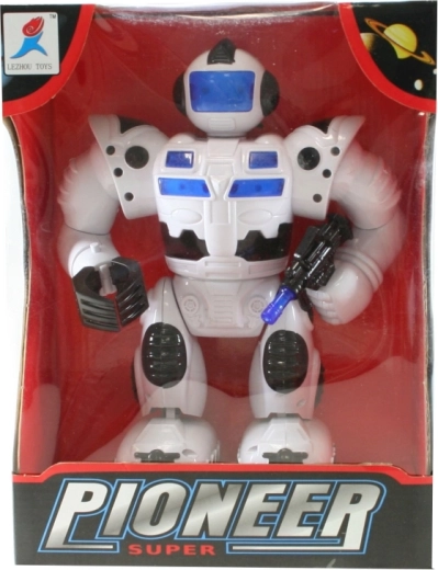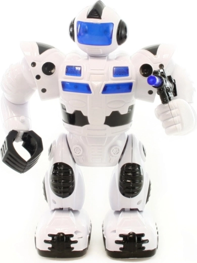 Robot op batterijen die loopt, licht geeft en geluiden maakt, en zijn armen en hoofd beweegt. Werkt op 4x AA-batterijen (niet inbegrepen). Afmetingen van de robot ca. 23 x 17 cm. Leeftijd 3+