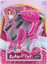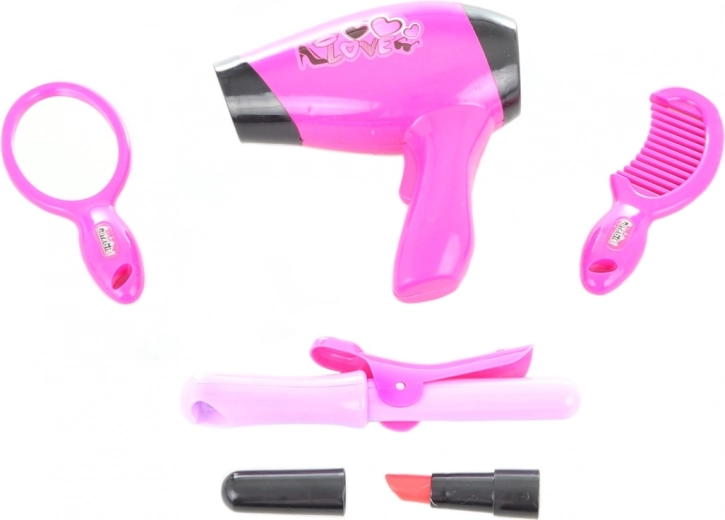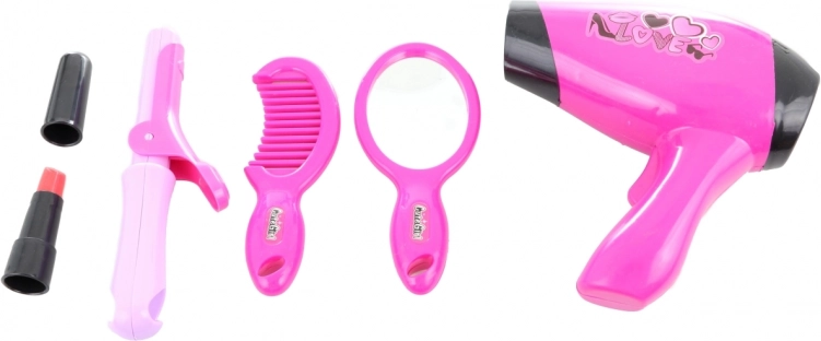 Deze roze beautyset biedt kinderen alles wat ze nodig hebben voor de eerste kappers-experimenten. De föhn, gevoed door 1× AA-batterij (niet inbegrepen), wordt aangevuld met een krultang, kam, handspiegeltje en cosmetische accessoires – allemaal aangepast aan kleine kinderhanden.
