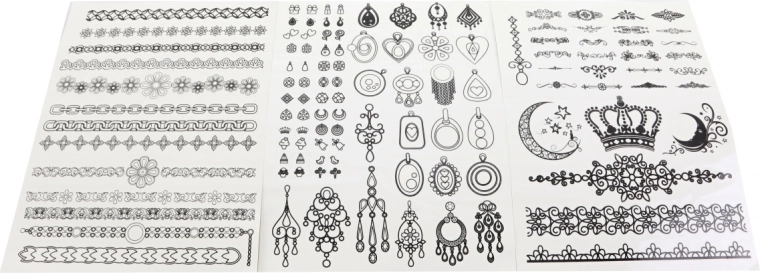 Ontdek de wereld van tijdelijke tatoeages en versieringen die je precies naar je stemming kunt aanpassen. De set biedt een ruime keuze aan motieven – van elegante lijnen en kettinkjes tot kronen, manen en ornamenten – en gekleurde stiften om details in te kleuren. Glinsterende steentjes geven elk motief een opvallende glans.