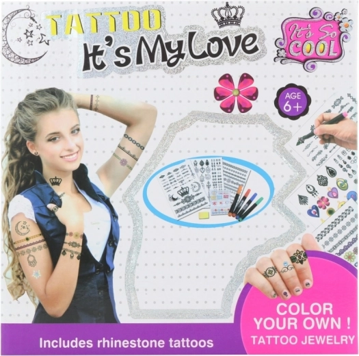 Vier gekleurde stiften aangevuld met zelfklevende steentjes geven je tatoeages kleur, diepte en een oogverblindende glans.