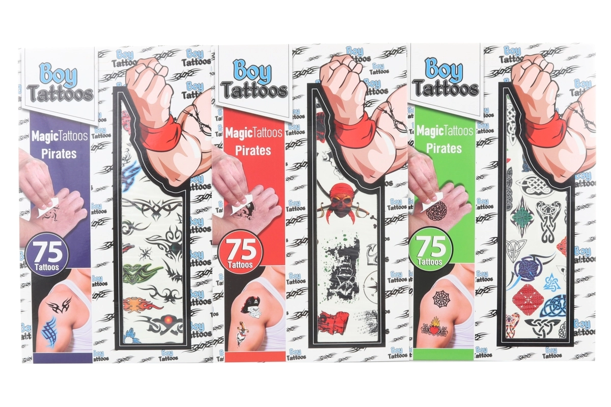 Ontdek een fantasiewereld met de set tijdelijke tatoeages voor jongens. Dankzij de rijke selectie van 75 motieven kiezen kinderen hun favoriete afbeeldingen en kunnen ze die naar hartenlust combineren. De tatoeages worden eenvoudig met water op de huid aangebracht en net zo makkelijk verwijderd.