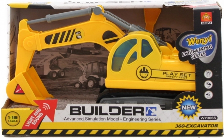Graafmachine op batterijen met afmetingen ca. 24 x 12 cm. Afmetingen van de verpakking ca. 25 x 10 x 14 cm. Werkt op 3x AG13-batterij (inbegrepen). De graafmachine maakt geluiden en geeft licht. Leeftijd 3+