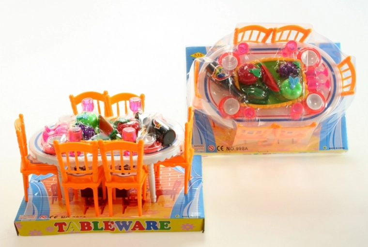 - Tafeltje, 6 stoeltjes, servies, eten voor poppen