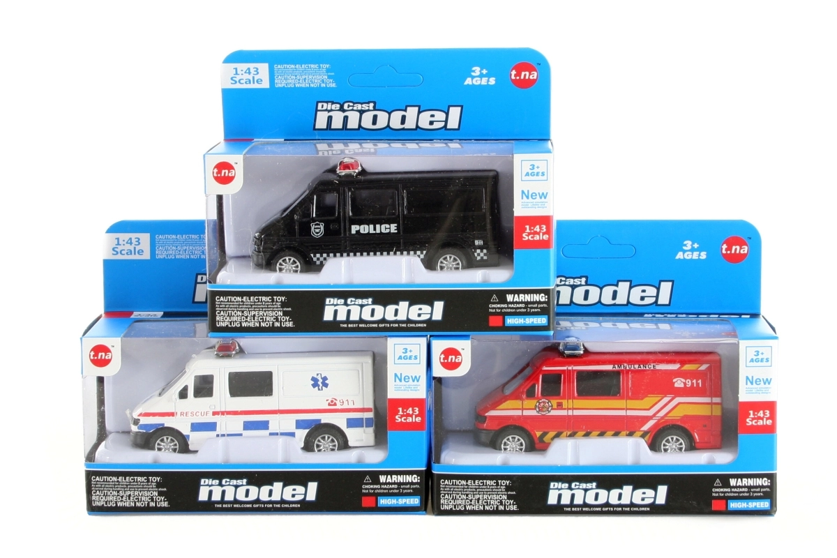 Deze metalen reddingsautootjes maken elke kleine fan van brandweer, politie en ambulancedienst blij. Dankzij de stevige constructie en vrijloop zijn ze makkelijk te bedienen en rijden ze uitstekend op elk oppervlak. De compacte afmetingen zijn ideaal voor kinderhandjes en voor onderweg.