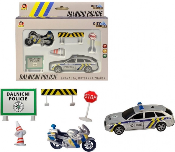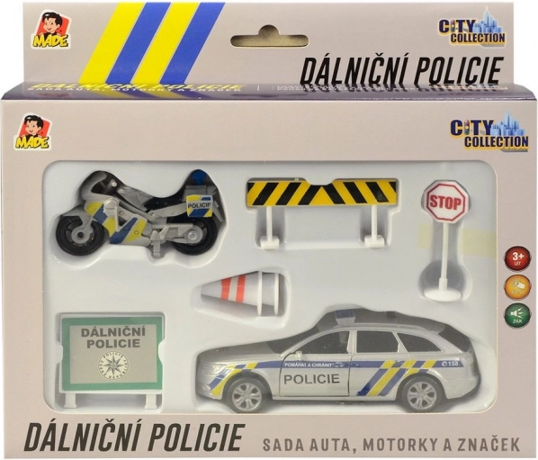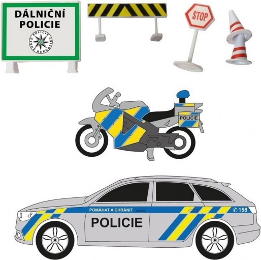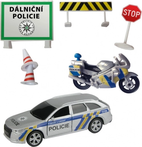 Realistische snelwegpolitieset in Tsjechisch design uit de City Collection die alle kleine wetshandhavers zal verrassen. Bevat een metalen politieauto met een licht- en geluidszwaailicht, een plastic motor en verkeersborden. Dankzij de pull-back aandrijving barst de actie op de weg meteen los. Ideaal voor kinderen vanaf 3 jaar.
