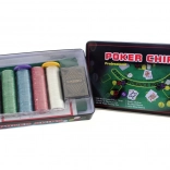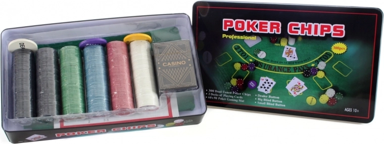 Complete grote pokerset in een robuust metalen blik voor thuis toernooien en plezier met vrienden. Bevat alles wat je nodig hebt: speelkaarten, chips, speelmat en handleiding. De compacte verpakking is gemakkelijk mee te nemen en is een ideaal cadeau voor pokerliefhebbers.