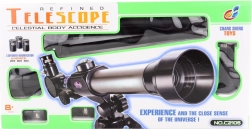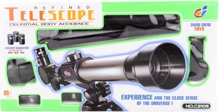 Kunststof telescoop met statief. Objectiefdiameter 60 mm, scherpstelafstand 170 mm, vergroting 20x, 30x en 40x. Afmetingen van de verpakking ca. 43 x 22 x 8 cm. Leeftijd 8+