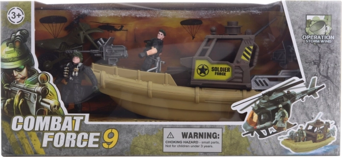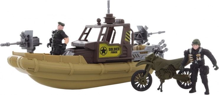 - Complete uitrusting – grote boot, motor en 2 soldatenfiguren.