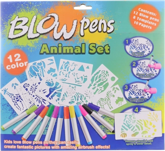 Ontdek creatief plezier met de blaasstiften met het thema safari. De grote set bevat 12 gekleurde stiften, 8 sjablonen, 6 vellen papier, een praktische kartonnen standaard met houder en een blaasopzetstuk met pompje voor eenvoudig en schoon knutselen. Ideaal voor kinderen vanaf 3 jaar.