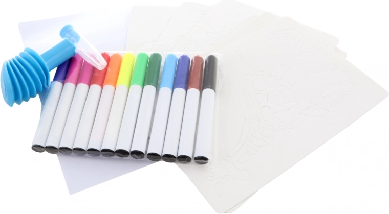 - 12 gekleurde stiften, 8 sjablonen, 6 vellen papier, kartonnen standaard met houder, blaasopzetstuk met pompje