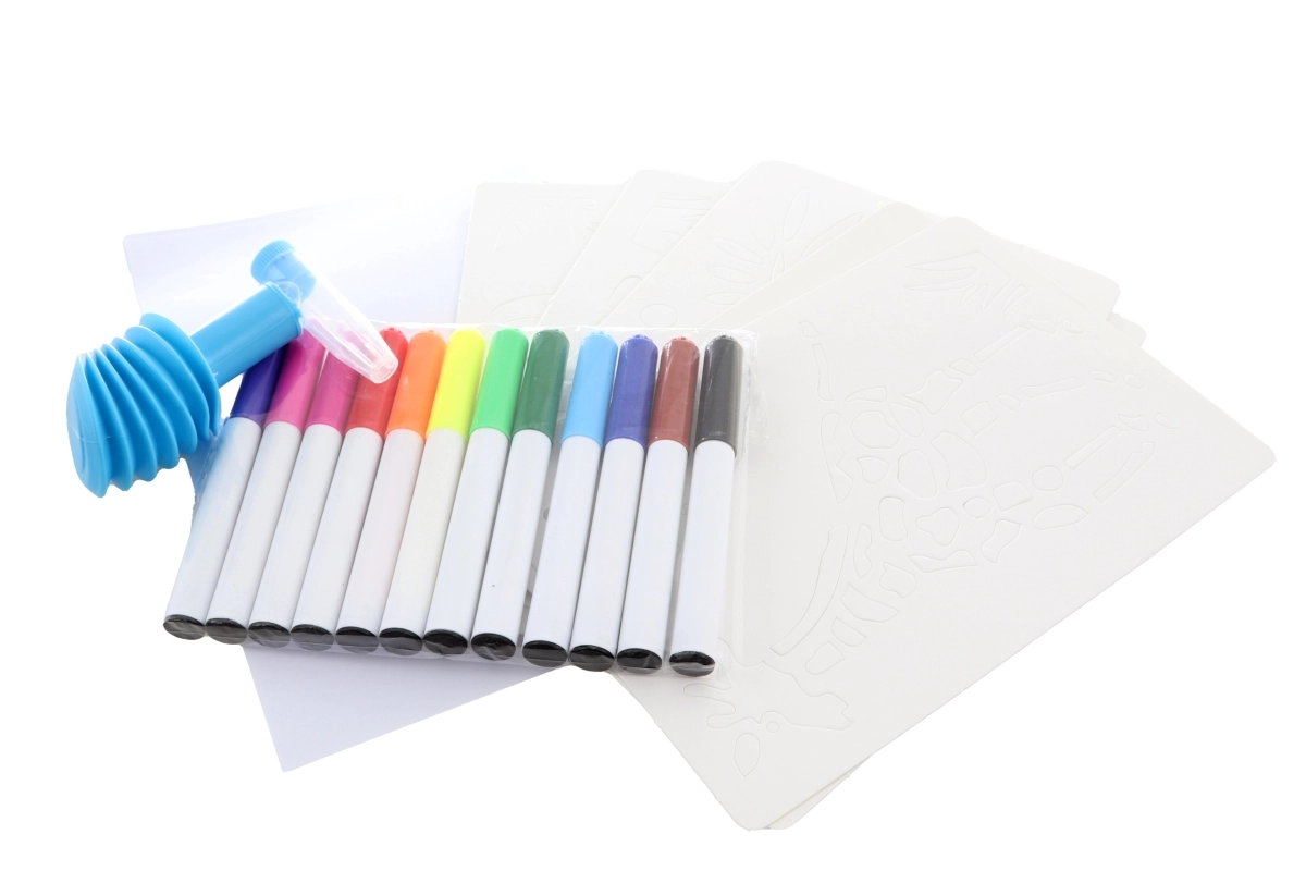 In de verpakking zit alles wat kinderen nodig hebben: sjablonen met diermotieven, glad papier en 12 levendige kleuren. Deze activiteit bevordert de fijne motoriek, creativiteit en concentratie, en is tegelijk leuk en veilig.