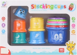 Kunststof opvouwbare bekers. Bevat 11 bekers in verschillende kleuren en maten. Afmetingen van de verpakking ca. 26 x 18,5 x 9 cm. Leeftijd 6m+