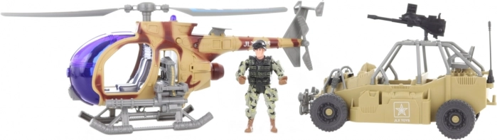 Ontdek actieve speelpret met deze militaire set op batterijen, inclusief een helikopter met licht en geluid, een gepantserde auto en een soldatenfiguur. Ideaal voor kinderen vanaf 3 jaar, direct speelklaar inclusief batterijen.