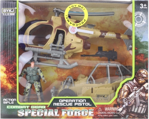 Deze realistische militaire set biedt kinderen volop plezier en ruimte voor fantasie. De helikopter licht op en maakt geluid na het indrukken van een knop, wat de spelbeleving versterkt. De set bevat ook een gepantserde auto en een soldatenfiguur voor complete actiescènes.