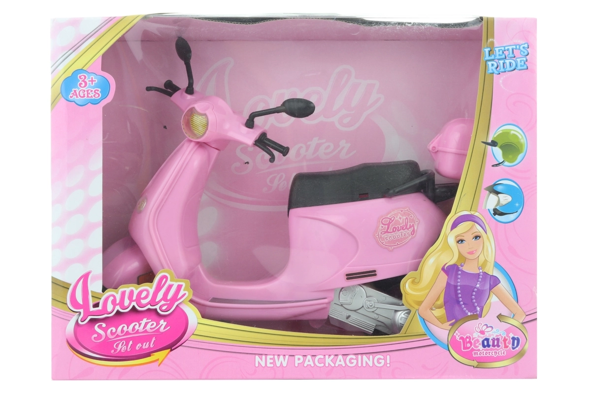 Stijlvolle plastic scooter voor poppen die elke kleine liefhebber van spelletjes zal verrassen. Biedt een realistische uitstraling, licht en duurzaam plastic materiaal en is ideaal voor creatief spel thuis en onderweg.