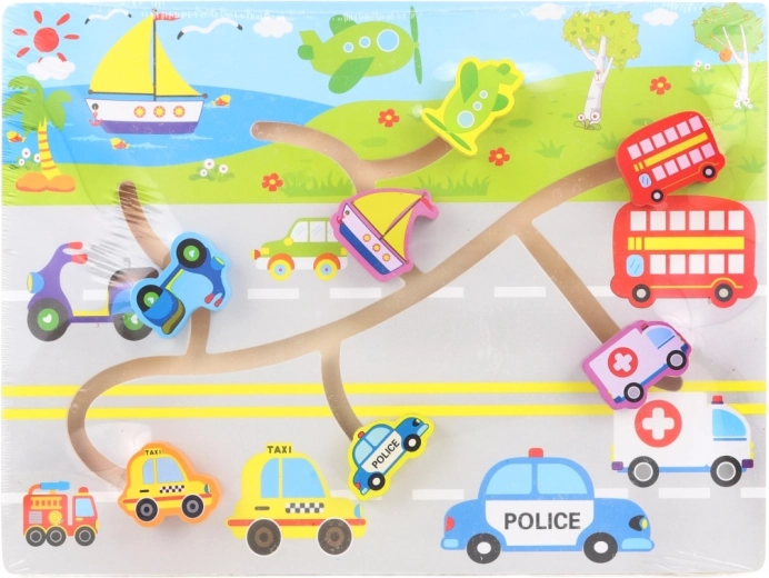 Ontdek het leuke en educatieve houten doolhof met vervoersmiddelen, dat de fijne motoriek, het logisch denken en de oog-handcoördinatie ontwikkelt. Ideaal als didactisch speelgoed voor kinderen vanaf 3 jaar, met veilig afgeronde randen en hoogwaardige afwerking.