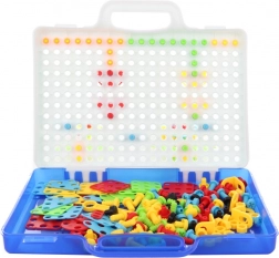 Alles is opgeborgen in een draagbare koffer met een deksel dat fungeert als pegboard, waardoor de set makkelijk te dragen en op te ruimen is. Een geweldige hulp voor de ontwikkeling van motoriek, oog-handcoördinatie, creativiteit en geduld.