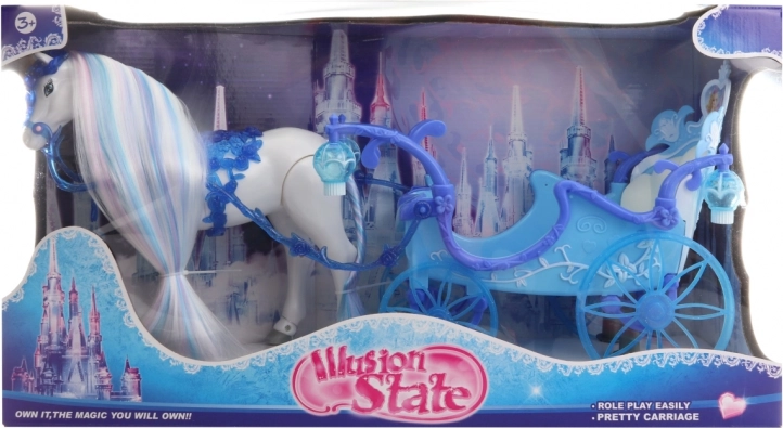 Paardje met blauwe koets. Na het plaatsen van batterijen loopt het paard, speelt muziek en branden de lantaarns op de koets. Werkt op 2 AA-batterijen (niet inbegrepen). Afmetingen van de verpakking ca. 56 x 30 x 19 cm. Leeftijd 3+