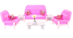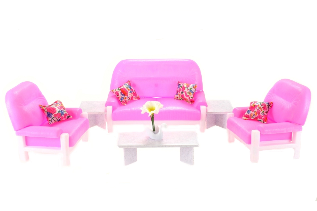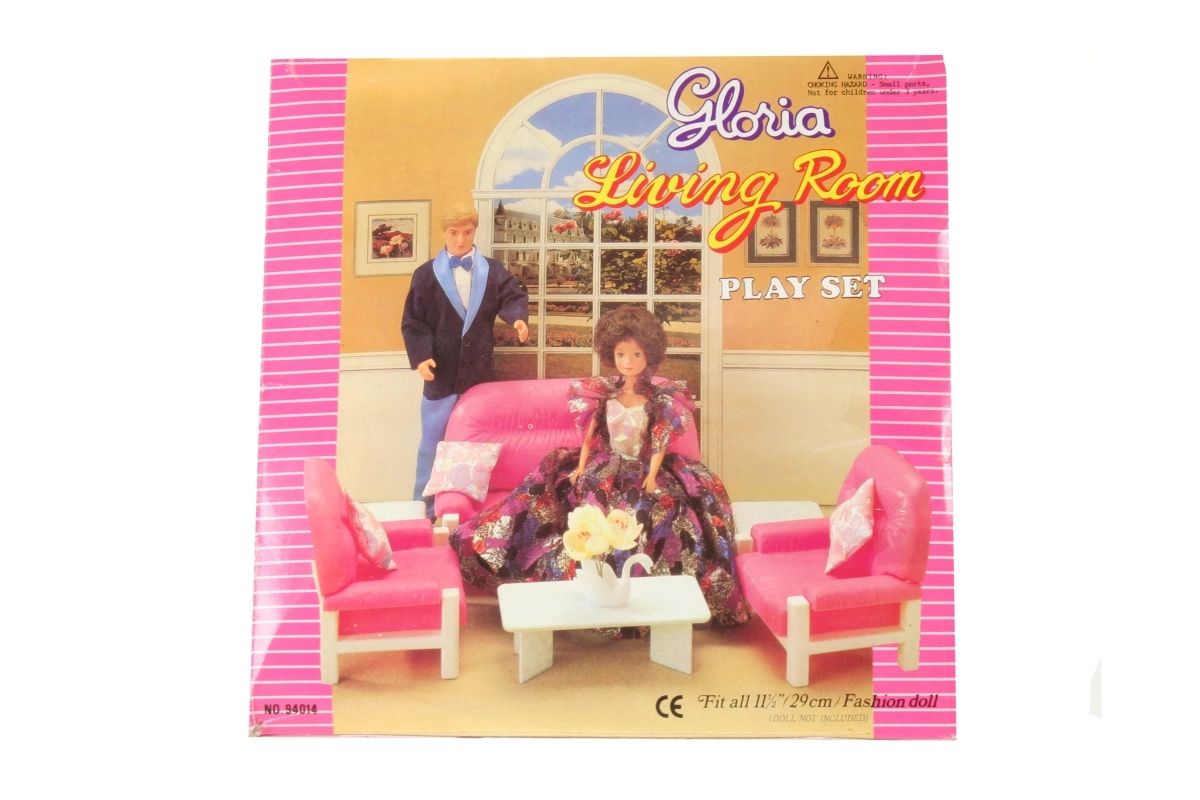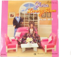 De Glorie Woonkamer bevat een plastic bank voor poppen met afmetingen ca. 22 cm x 11 cm x 13 cm, 2 plastic fauteuils met afmetingen ca. 13,5 cm x 11 cm x 13 cm, een plastic tafeltje ca. 7,5 cm x 15 cm x 5 cm met een accessoire voor op de tafel – een plastic zwaan met bloemen, 2 plastic krukjes ca. 7,5 cm x 4 cm. Als accessoires zijn er 4 kussentjes. Pop en poppenjongen zijn niet inbegrepen. Leeftijd 3+