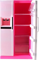 De Gloria koelkast is vormgegeven met realistische details in wit-roze, die een echt apparaat nabootsen, en bevat verschillende vakken voor speelfuncties.