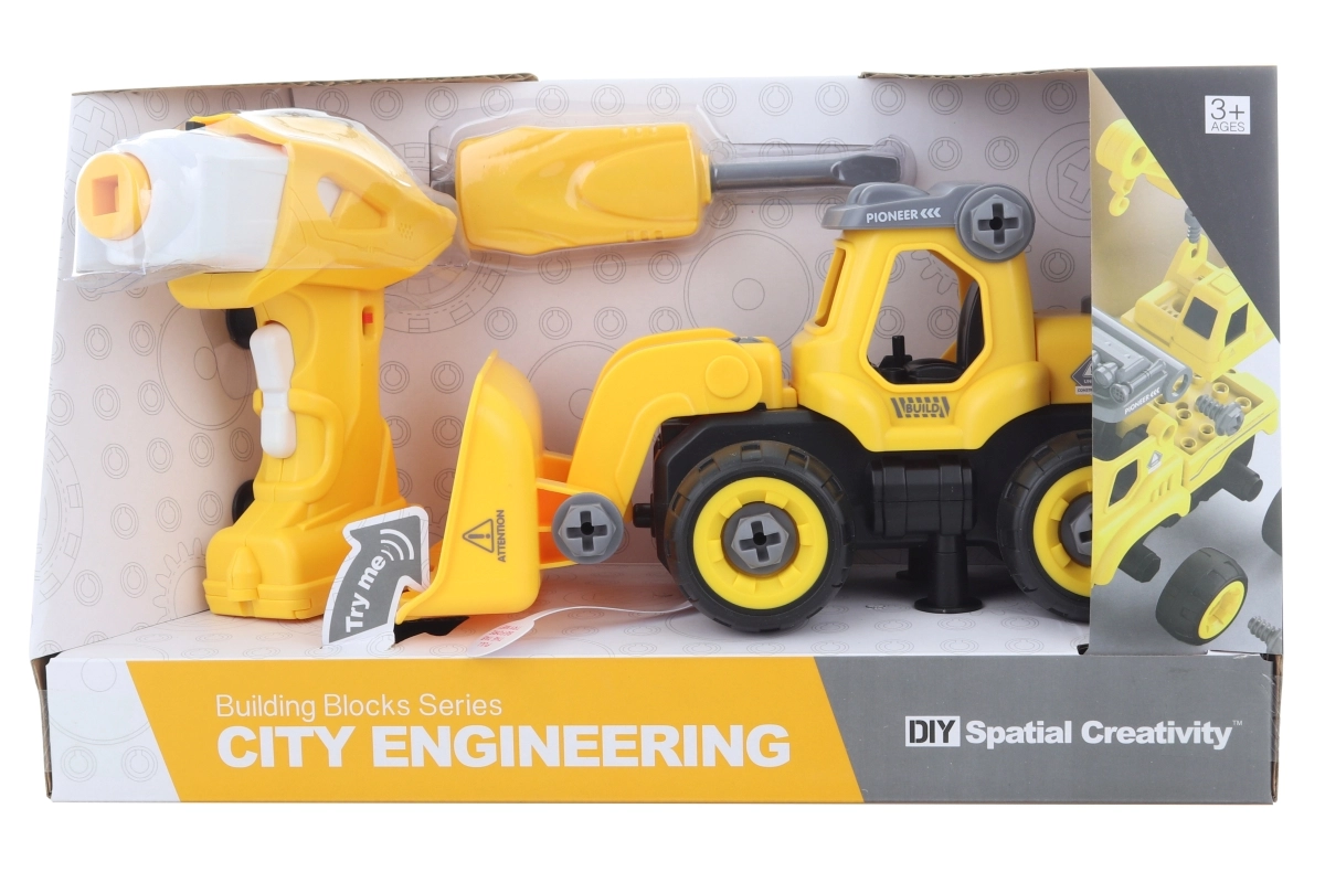 Ontdek bouwplezier met de schroefbare wiellader die kinderen eerst in elkaar zetten en vervolgens op afstand bedienen. Met de meegeleverde schroevendraaier of boormachine oefenen kleine klussertjes hun fijne motoriek en logisch denken. De motor kan uit de boormachine worden gehaald, in de wiellader worden geplaatst en direct klaar om aan de slag te gaan – vooruit en achteruit rijden met een druk op de knop. Realistische geluiden maken het spel extra echt.