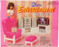De set is gemaakt van duurzaam plastic en bevat een comfortabele fauteuil met voetenbank, een praktische woonkamerwand met deurtjes, een hoekkast en multimedia-uitrusting. Compacte afmetingen van de onderdelen maken hanteren en opbergen eenvoudig.