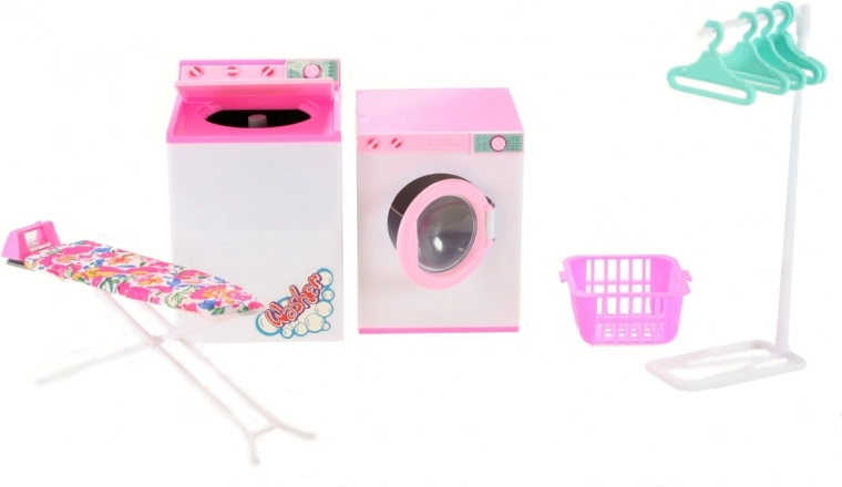 - Inhoud van de set: wasmachine (te openen voorste klep), droger (te openen bovenklep), strijkplank, speelgoedstrijkijzer, kledingrek met 5 hangers, wasmand