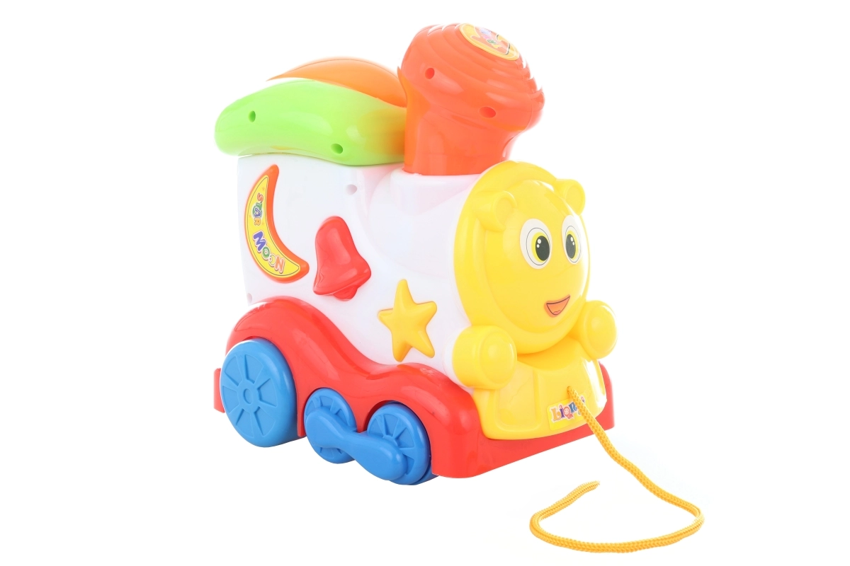 Leuke kunststof trek-locomotief voor de allerkleinsten, die bij het bewegen en het indrukken van de schoorsteen een vrolijk piepgeluid maakt. Ideaal voor de ontwikkeling van motoriek en zintuiglijke stimulatie. Afmeting ca. 20 × 17 cm, licht en gemakkelijk vast te houden voor kinderen vanaf 18 maanden.