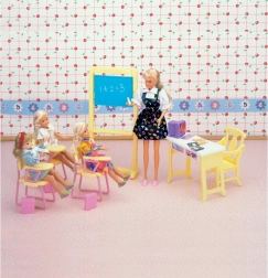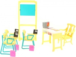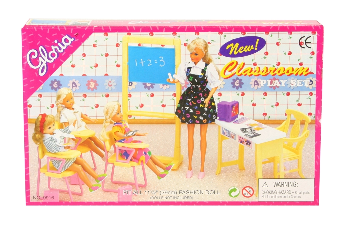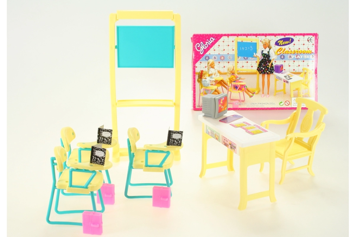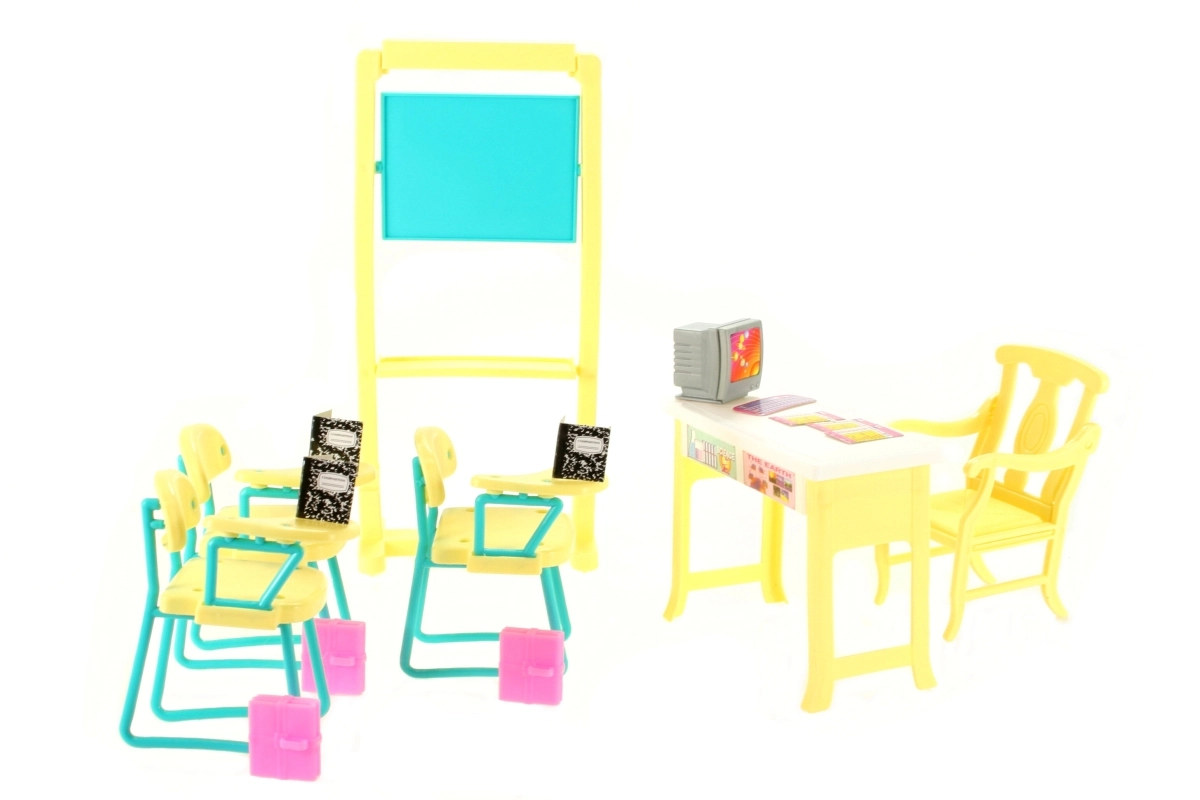 De set bevat een ruim schoolbord, een lerarenhoek met computer en stoelen voor leerlingen. Dankzij de compacte afmetingen is de set compatibel met gangbare poppen en eenvoudig op te bergen.