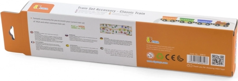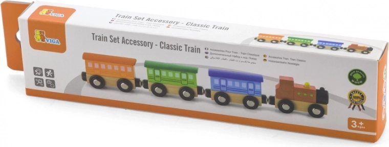 De Klassieke trein houten set bevat 4 delen die met magneten verbonden zijn. Dit speelgoed is ontworpen door de gerenommeerde fabrikant van houten speelgoed, Viga Toys. De set kan worden gebruikt als een op zichzelf staand speelgoed, of als een aanvulling op andere treinbanen, bouwsets en sets.