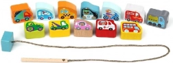 De Cubika rijg voertuigen set bevat 12 houten elementen met verschillende vervoersthema's en één 45 cm lang koord met een houten pin. Kinderen kunnen hun geheugen en behendigheid oefenen en zich vermaken met educatieve spelletjes door middel van de 8 bijgevoegde sjablonen.