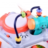 - Zijde met hamertje: sla op de knoppen om een balletje door een transparante tunnel te laten bewegen, begeleid door geluiden en licht; daarnaast een beweegbare banaan en appel aan een zelfoprollend koord.
