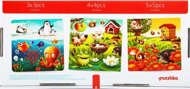 Ontdek spelenderwijs leren met de Puzzlika favoriete dieren 3-in-1 puzzel. De doos bevat in totaal 50 grote stukjes waarmee kinderen 3 afzonderlijke afbeeldingen van 25 × 25 cm leggen met verschillende moeilijkheidsgraden (3×3, 4×4, 5×5). Dankzij de kleurrijke diermotieven en opvallende kleuren is puzzelen aantrekkelijk en motiverend voor kleuters.