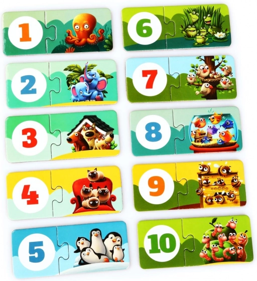 Leuke leerset voor de allerkleinsten: 20 stevige stukjes vormen 10 paren, die kinderen koppelen op basis van het aantal dieren en de cijfers 1–10. Het spel stimuleert logisch denken, fijne motoriek en cijferherkenning, is gemaakt van duurzaam meerlaags karton en is eenvoudig te onderhouden door af te nemen met een vochtige doek.