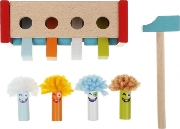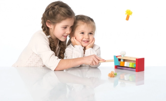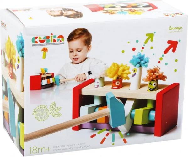 Houten hamertafel met springende clowns van CUBIKA verandert spelen in leuk leren. Kinderen slaan met het hamertje op de kleurrijke elementen en zien hoe de clowns omhoog springen – dit stimuleert fijne motoriek, oog-handcoördinatie en logisch denken. Gemaakt van esdoorn en beukenhout, met veilige, watergedragen verven en Europese productie.
